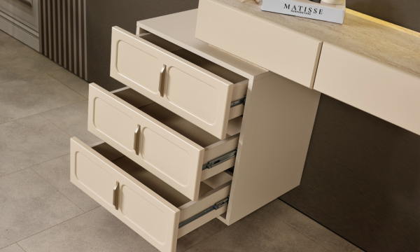 MDF malzemeden üretilmiştir. Bir ayağı dekorlanmış parlak metal malzeme iken diğeri gold renk kaplama ahşaptır.. Şifonyer aynası çerçevesi LED aydınlatmalı olarak üretilmiştir. |